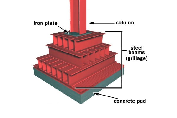 2. Steel grillage foundation: While casting foundation for heavy structures, the foundation is provided with a steel framework to get the load of the structure distributed over the ground known as a steel grillage foundation. The heavy steel beams induced are in two or more tiers and are also known as rolled steel joist(RSJ).